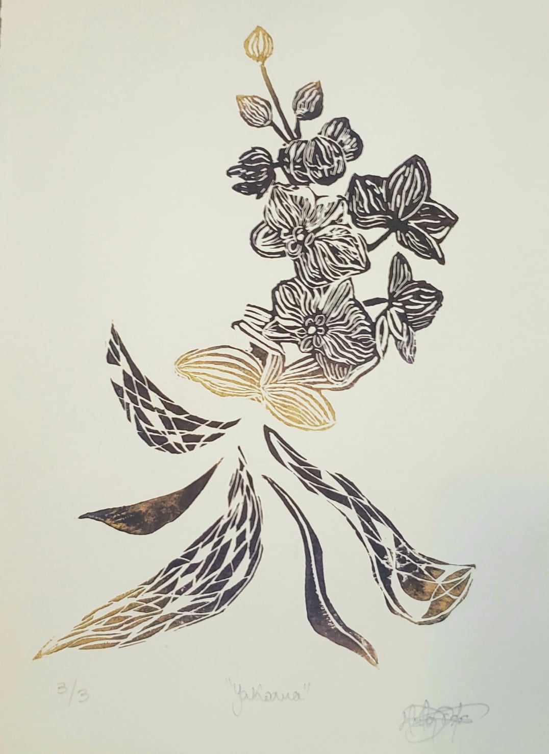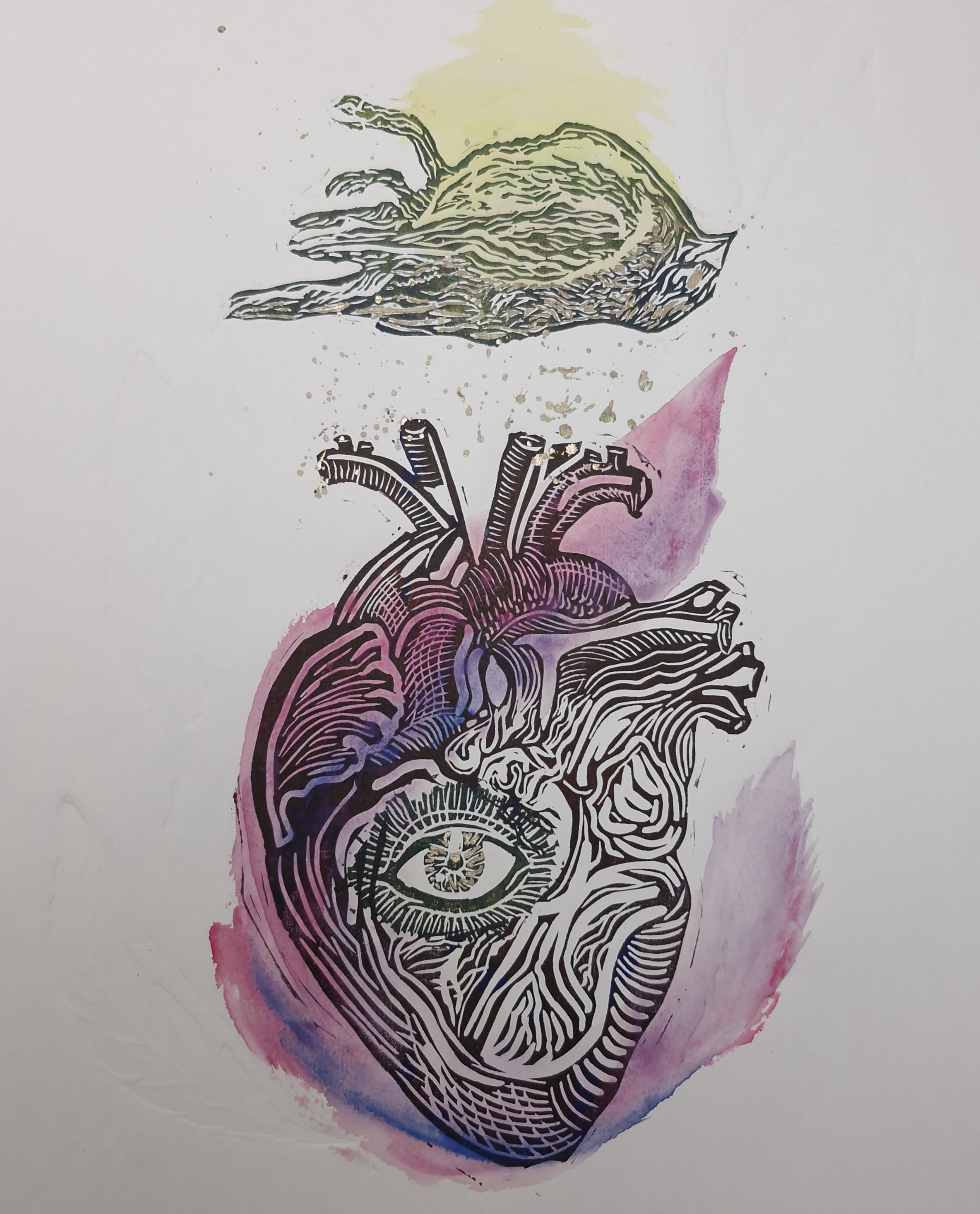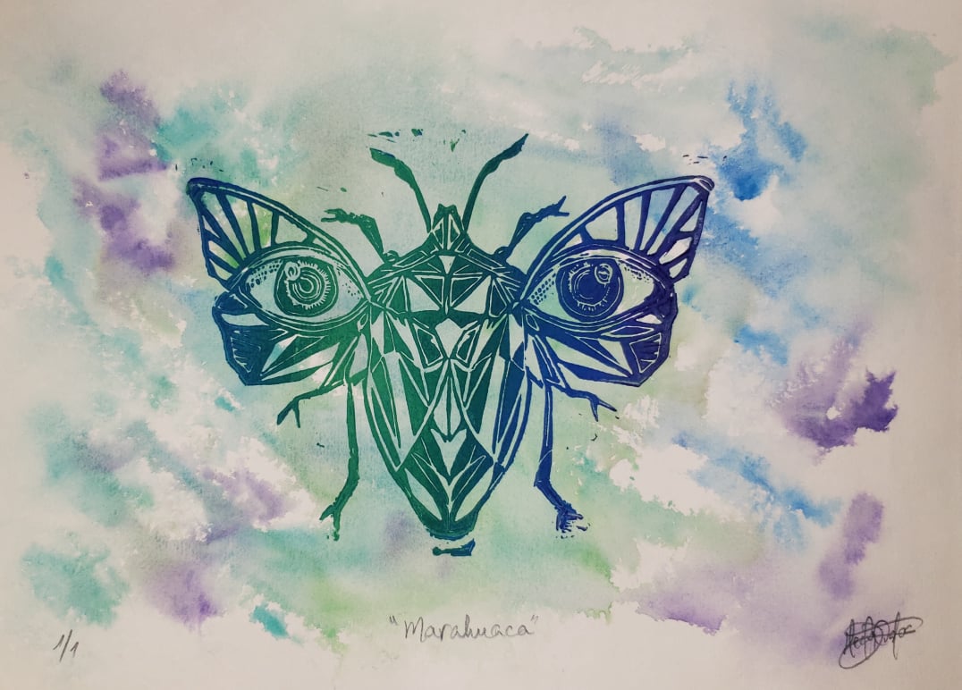 Marahuaca grabado sobre acuarela 25 x 35 cms.